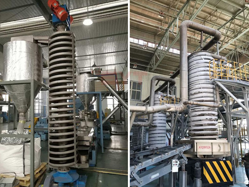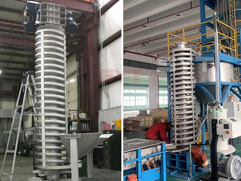 垂直振动提升机可以对颗粒状、块状、粉状的固体物料(粘度不大)都可以输送,是我厂生产的一种新型的垂直振动输送设备。采用振动电机作振动源,利用两振动电机的合成振幅,将物料沿螺旋输送槽向上输送。